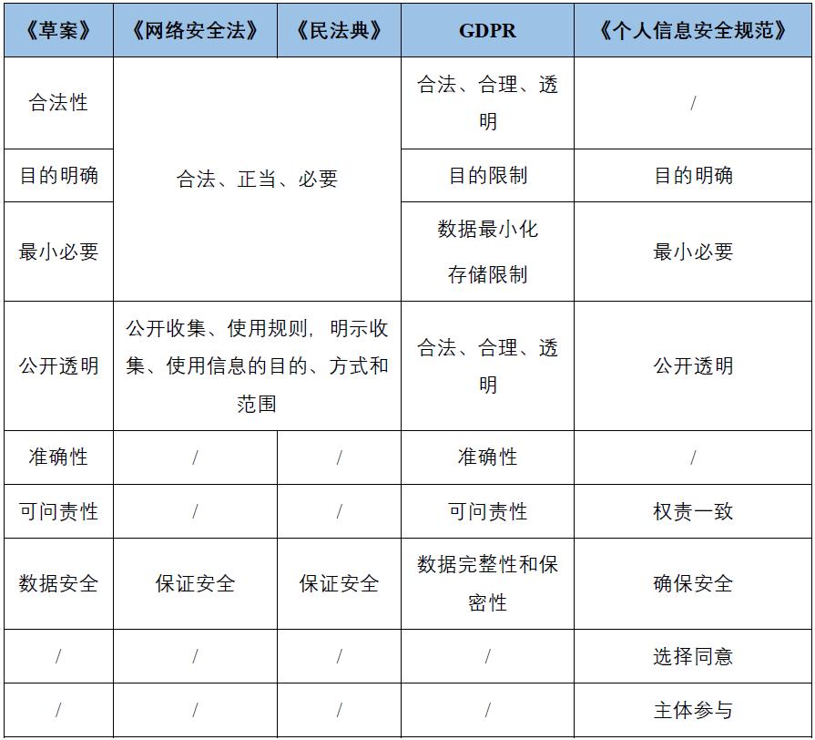 《草案》规定了个人信息处理的七大基本原则:合法性原则(第五条)、目的明确原则(第六条)、最小必要原则(第六条)、公开透明原则(第七条)、准确性原则(第八条)、可问责性原则(第九条)、数据安全原则(第九条)。这七大原则与既往的相关法律法规一脉相承,又有新的突破,对比如下表: