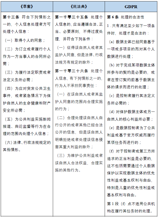 GDPR就处理个人数据设定了六项合法基础,而《网络安全法》仅将同意视为处理个人信息的唯一合法基础,这一苛刻的规定也是业界所诟病之处。《草案》延续《民法典》的规定,突破了《网络安全法》的限制,更深入地借鉴了GDPR关于合法基础的规定。