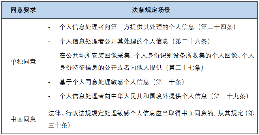 《草案》专门规定了此前未曾明确规定过的单独同意、书面同意的形式要求,需要满足该等特殊要求的情形如下: