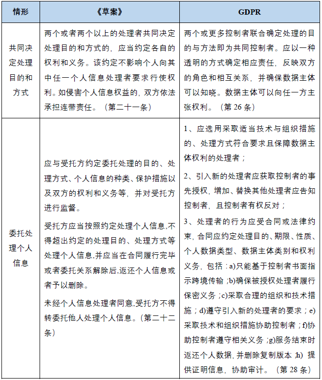 通过以上对比我们可以得知,《草案》对共同决定处理目的和方式以及委托处理个人信息的规定,与GDPR所规定的共同控制者和处理者的义务基本一致。《草案》实质上延续了《个人信息安全规范》中对于共同个人信息控制者[10]和委托处理[11]的规定。但是,区别于《个人信息安全规范》的细致性规定,《草案》以一种更为洗练、简明的方式设定了数据处理各方的义务边界。