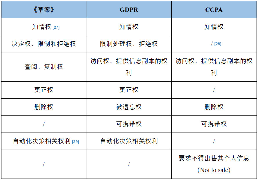 上述《草案》规定的法定权利与GDPR以及《加利福尼亚州消费者隐私法》(“CCPA”)的对比如下: