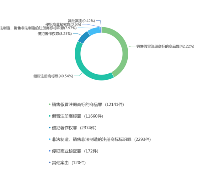 笔者通过alpha案例库检索知识产权刑事案件,截止至2020年10月5日,在该数据库中可以检索到的知识产权犯罪案件为28760件,案件数量整体呈现逐年上升趋势:2012年以来,平均每年的数量超过1000件,2014年达到4000件高峰后稍有回落,2019年达到历史峰值(见图1:知识产权刑事案件历年案件数量图),可见近十年以来,我国知识产权的刑事保护一直处于不断加强的状态。其中商标类刑事犯罪占比超90%,著作权犯罪超8%,而商业秘密犯罪仅占知识产权刑事案件的0.6%(见图2:知识产权刑事案件案由分布图),