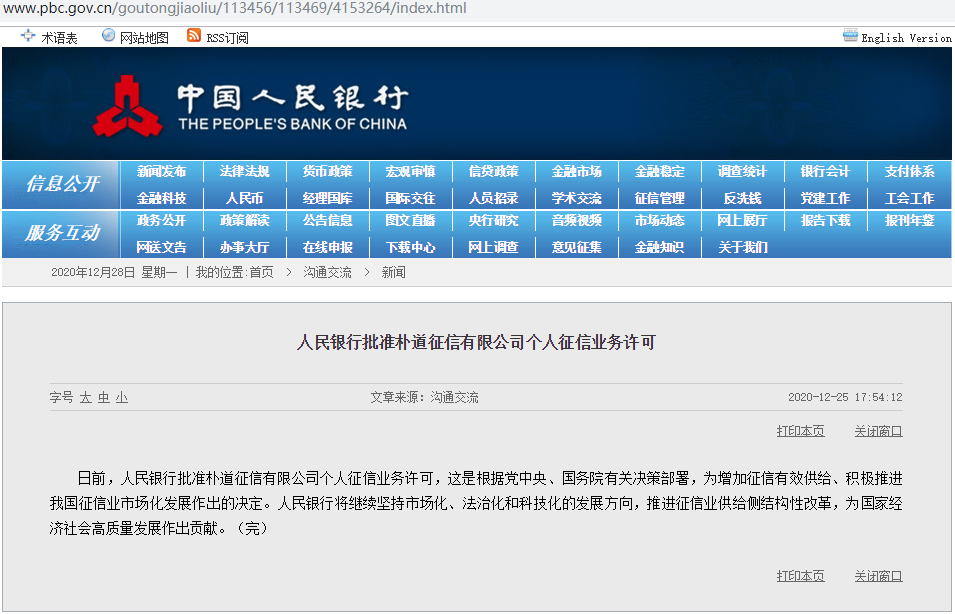 2020年12月25日,人民银行在其官网发布《人民银行批准朴道征信有限公司个人征信业务许可》,披露日前已批准朴道征信有限公司(以下简称“朴道征信”)个人征信业务许可。人民银行指出,该许可是根据党中央、国务院有关决策部署,为增加征信有效供给、积极推进我国征信业市场化发展作出的决定。人民银行将继续坚持市场化、法治化和科技化的发展方向,推进征信业供给侧结构性改革,为国家经济社会高质量发展作出贡献。[2]