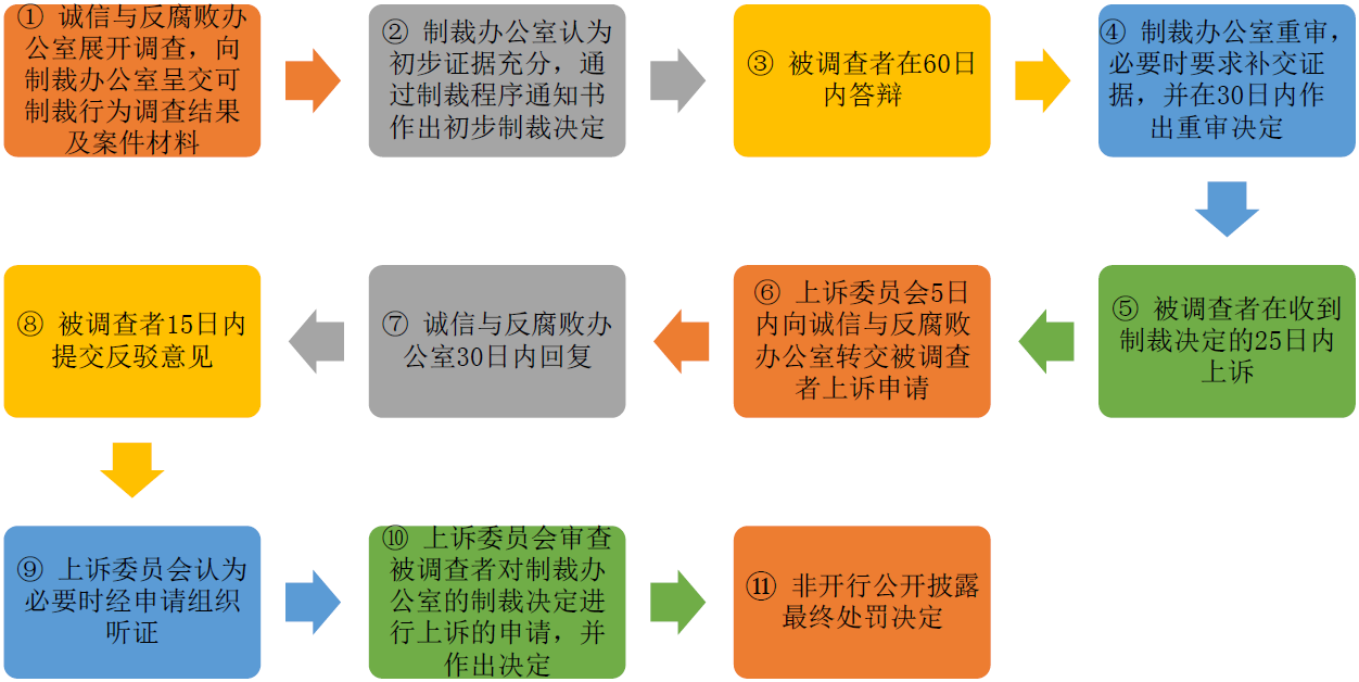 回到本部分开头提到的两级制裁程序,以非开行为例,简而言之,就是第一级程序上,非开行的调查机构——诚信与反腐败办公室通过问询和调查,得出可制裁行为调查结果结论,将案件材料转交制裁办公室,由其作出初步制裁决定。被调查者有权进行答辩,后由制裁办公室作出重审决定。第二级程序上,如果被调查者对重审决定依然不服,可以提出上诉,此时诚信与反腐败办公室需要对上诉申请作出回应甚至补充证据,被调查者可以进行二轮反驳,由上诉委员会在必要时组织听证,作出最终决定,并随后由非开行公布。为便于读者理解,我们画了示意图,供各位参考。