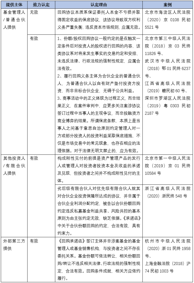 与保本保收益承诺不同,份额回购/转让协议是通过未来一定时期或一定条件下的回购/转让交易安排实现对投资人投资权益的保障,具有保底的隐蔽性和回购/转让交易的合理性。对于基金管理人或普通合伙人作为份额回购方或受让方的份额回购/转让协议,尽管存在被法院穿透认定为保本保收益承诺,以违反资本市场规则而被认定无效,但更多的司法判例基于回购/转让交易的合理性、各方意思表示的真实性和对公共利益的无害性认可了其有效性。对于基金管理人/普通合伙人之外的其他投资人或有限合伙人及外部第三方作为份额回购方或受让方的份额回购/转让协议,法院也通常尊重各方真实意思表示,认定协议有效。