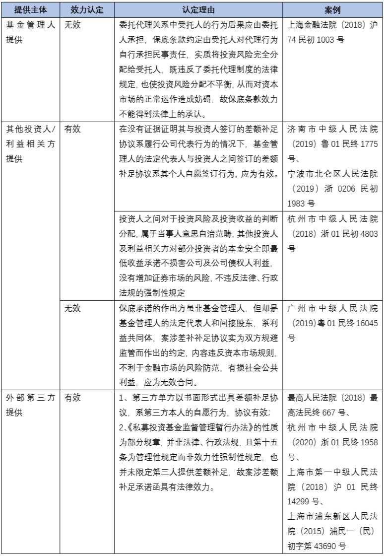 《九民会议纪要》第90条对结构性资管产品中劣后级受益人提供的差额补足义务作出了规定,“信托文件及相关合同将受益人区分为优先级受益人和劣后级受益人等不同类别,约定优先级受益人以其财产认购信托计划份额,在信托到期后,劣后级受益人负有对优先级受益人从信托财产获得利益与其投资本金及约定受益之间的差额承担补足义务,优先级受益人请求劣后级受益人按照约定承担责任的,人民法院依法予以支持”;第91条对差额补足协议的相关性质作出了规定:“信托合同之外的当事人提供第三方差额补足、代为履行到期回购义务、流动性支持等类似承诺文件作为增信措施,其内容符合法律关于保证的规定的,人民法院应当认定当事人之间成立保证合同关系。其内容不符合法律关于保证的规定的,依据承诺文件的具体内容确定相应的权利义务关系,并根据案件真实情况确定相应的民事责任”。可见,在私募基金投资领域,判断差补协议的有效性应根据差补协议的实质内容,重点判断差额补足义务人是否为私募基金管理人、代销机构或利益关联方。对于私募基金管理人、代销机构及其利益关联方提供的差额补足协议,司法实践中一般以违反资本市场规则认定为无效;对于其他投资人及外部第三方提供的差额补足协议,一般认定为有效。