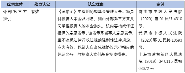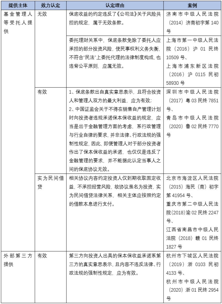 在过往司法实践中,对于外部第三方提供的保本保收益承诺,法院通常予以支持,而对于基金管理人等委托投资关系中的受托人所提供的保本保收益承诺,则存在不同的认定结果和理由:(1)认定无效,无效的理由通常为保底收益违反了风险共担和委托代理法律制度的内涵;(2)认定有效,有效的理由通常为保底收益的约定是各方真实意思表示,且不违反法律、行政法规的强制性规定(证监会的相关监管规定并非法律、行政法规的强制性法律规定);(3)也有法院穿透本质认定保底收益的约定是以委托投资为表现形式的借贷,按照民间借贷处理。