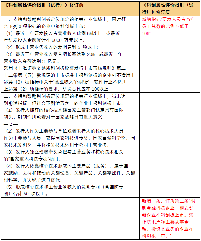 2020年3月,证监会在总结前期审核注册实践的基础上,会同有关部委认真研究论证,出台了《科创属性评价指引(试行)》(以下简称《指引》),明确将“3+5”的常规指标和例外条款成为判断企业科创属性的核心内容。企业如同时满足3项常规指标,即可认为具有科创属性;如不同时满足3项常规指标,但是满足5项例外条款的任意1项,也可认为具有科创属性[1]。2021年4月16日,证监会发布《关于修改<科创属性评价指引(试行)>的决定》,对《指引》作了修订,主要的修订内容如下[2]: