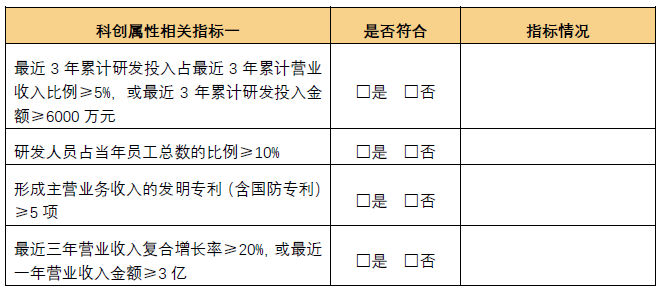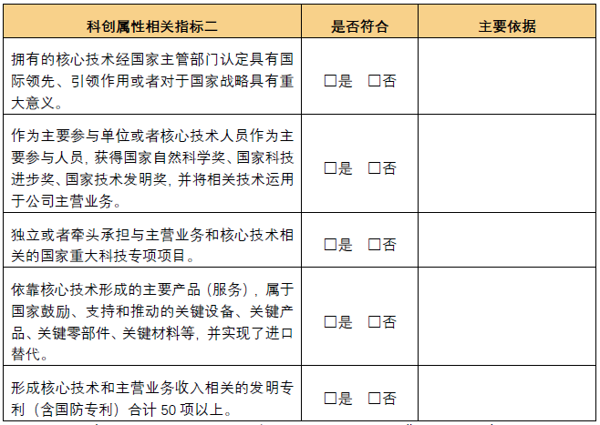 公司可选择科创属性相关指标一或者科创属性相关指标二进行说明。选择科创属性相关指标二的,可选择其中任意一项情形进行说明。至此,形成“4+5”的科创属性评价指标。