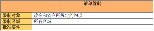 清单管制,是指对货物和技术进行清单管理的制度。对外出口该等管制货物或提供该等管制技术时,需要事先获得日本经济产业省大臣的批准。货物的管制清单记载于《出口贸易管理令》附表一中的第1~15项,技术的管制清单则规定在《外汇令》的附表一中的第1~15项中,对于作为管制对象的货物或技术的功能及规格,则规定在相关省令中。