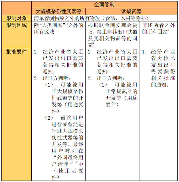 全面管制是指针对可能被用于大规模杀伤性武器及一般武器开发等的货物及技术的管制制度。对于属于全面管制的货物及技术的出口,需要事先获得日本经济产业省大臣的批准。