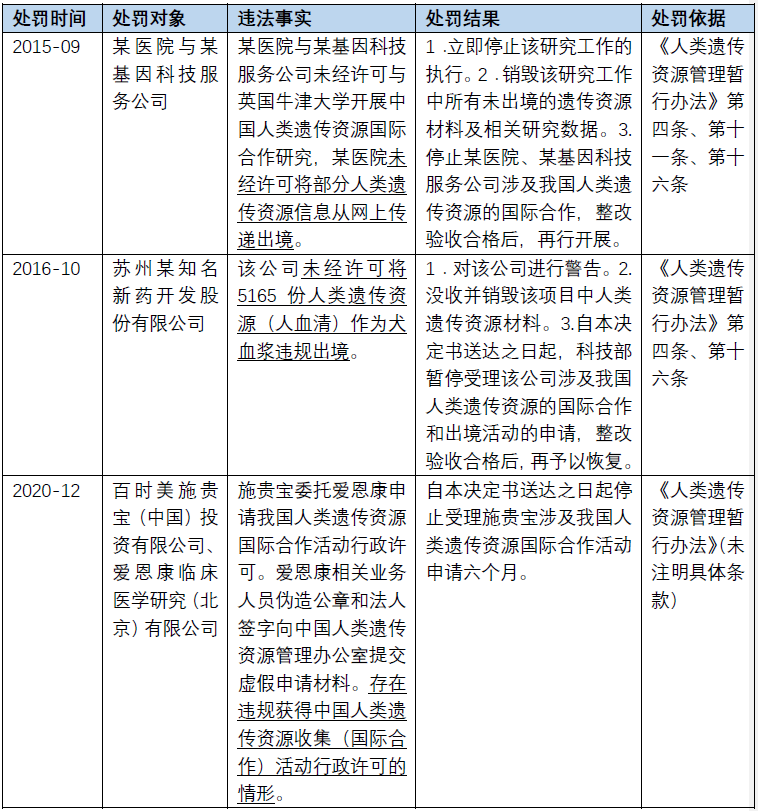 以下选取了科技部发布的关于人类遗传资源管理事项的处罚案例[18]: