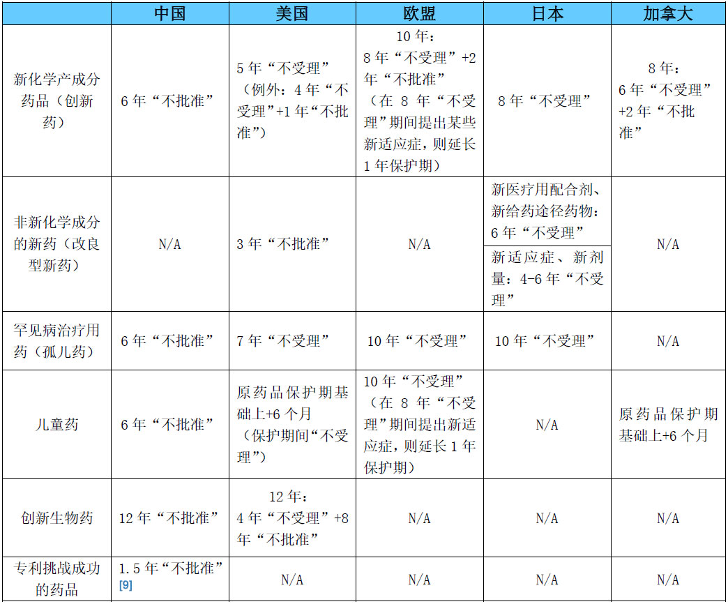 附:我国与全球其他主要药品市场的药品数据保护期及保护方式对比表
