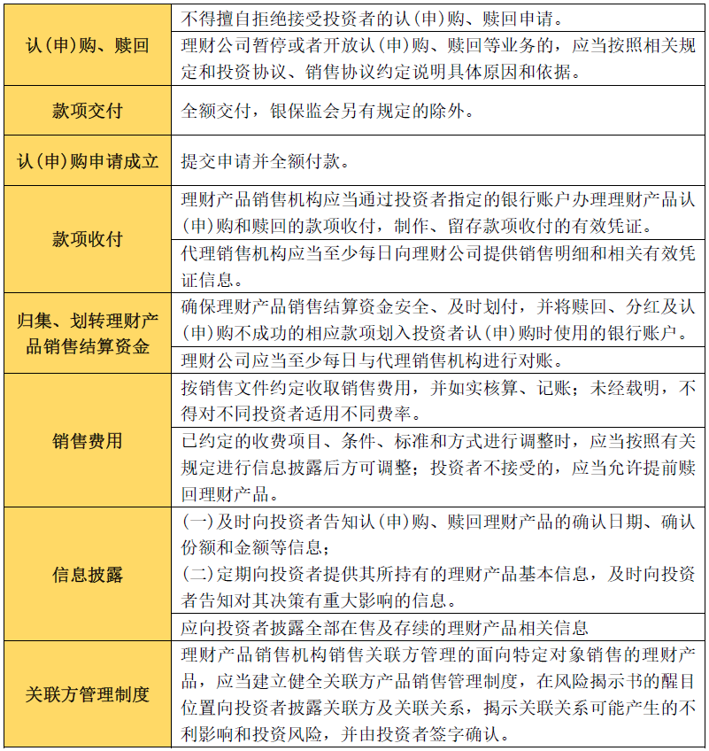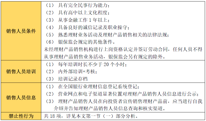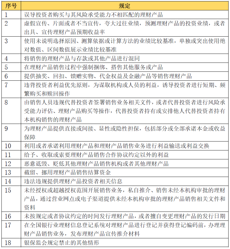 《销售管理办法》以列举和兜底的形式对理财产品销售机构及其销售人员从事理财产品销售业务活动进行了规定,共18条: