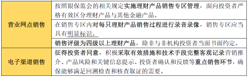 (2)禁止通过电子渠道提供未经审批的理财产品销售相关文件和资料。对于销售人员的通过电子渠道进行销售的行为规范做了进一步加强。