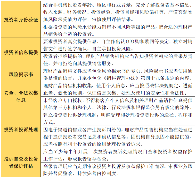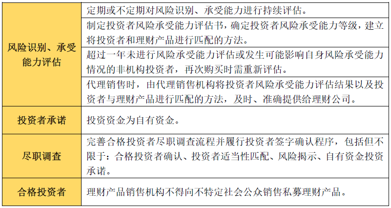 《销售管理办法》就理财产品销售机构对购买理财产品的投资者风险识别和承受能力评估、投资者承诺、尽职调查、合格投资者内容进行了规定,具体如下: