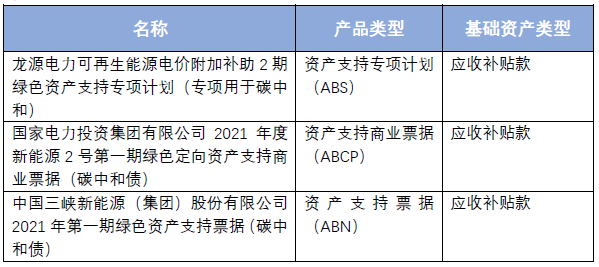2021年伊始到4月初,成功发行的碳中和资产证券化项目中,以可再生能源发电应收补贴款作为基础资产的有3只[4]: