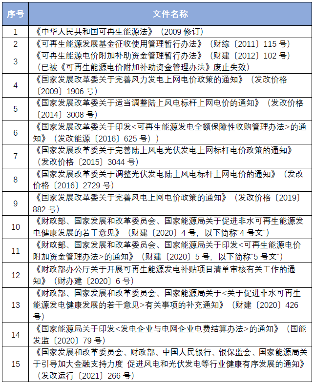 自《可再生能源法》原则性地提出,“电网企业收购可再生能源电量所发生的费用,高于按照常规能源发电平均上网电价计算所发生费用之间的差额,由在全国范围对销售电量征收可再生能源电价附加补偿”[6]以来,财政部、发改委、国家能源局等各部门陆续出台了多个文件对其予以规定、调整,主要相关文件整理如下: