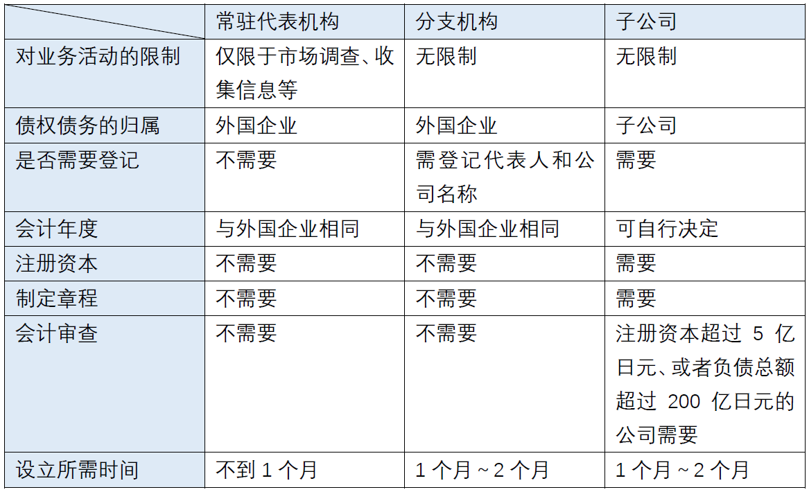 在日本设立据点,有以下几种方法:①设置常驻代表机构;②设置分支机构;以及③设立子公司。