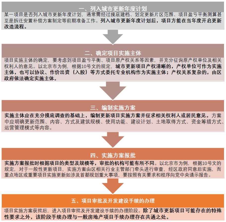城市更新项目的操作流程通常包括以下几个步骤(各地区规定的具体操作流程可能存在差别):