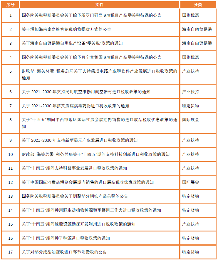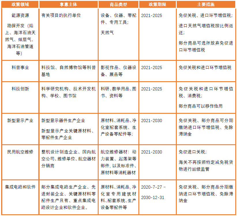 今年上半年,国家出台了17项进出口税收政策,其中涉及产业扶持的6项,包括科技创新、新型显示产业、集成电路和软件开发,能源资源勘探开发、航空维修以及科普事业;涉及海南自由贸易港的2项,分别是离岛旅客免税购物新增提货方式和岛内自用生产设备“零关税”;涉及特定货物的5项,包括种子种源、生动植物种源以及军警工作犬、抗艾滋病药物、成品油和钢铁产品;涉及国际展会的2项,分别是中国国际消费品博览会和中西部地区国际性展会进口展品的税收优惠;涉及国别优惠的2项,分别给与贝宁共和国和所罗门群岛97%税目产品零关税待遇。这些进出口税收政策以扶持和培育重点行业、领域快速发展为主,同时按照“碳达峰”“碳中和”的发展要求引导和督促相关企业调整供应链安排。上述进出口税收政策主要执行期限从5年、10年到长期不等;各项税收政策对应的海关监管要求也各不相同,值得相关企业关注。我们选择重点内容做如下分析: