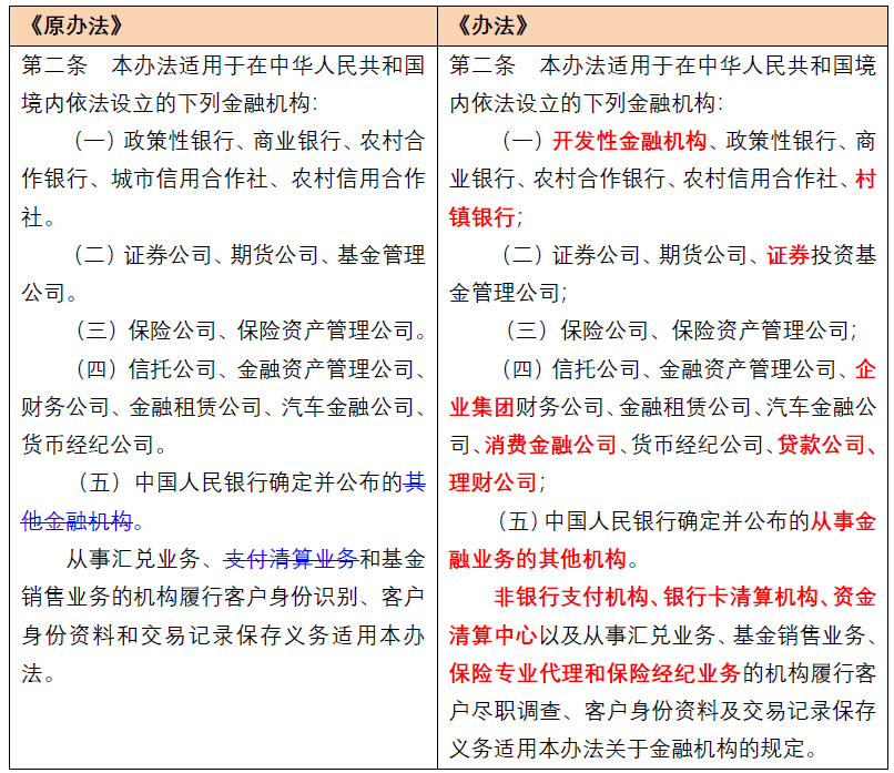 相较于《原办法》,《办法》第二条明确将开发性金融机构、村镇银行、消费金融公司、贷款公司、理财公司、从事保险专业代理和保险经纪业务的机构纳入适用范围,并将兜底条款由“其他金融机构”修改为“从事金融业务的其他机构”,衔接《反洗钱法征求意见稿》将特定非金融机构纳入反洗钱义务主体的规定。