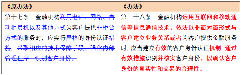 随着数字技术的发展,金融机构以“非面对面形式”与客户建立业务关系或者为客户提供金融服务的情况更加普遍,《办法》细化了这一情形下应该实施的客户身份认证机制,要求应达到“确认客户身份的真实性和交易的合理性”。