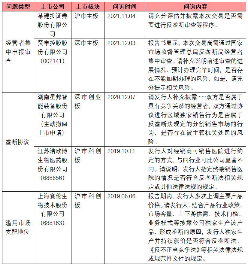 我们在下表中总结了近几年部分上市企业/拟上市企业收到的反垄断相关监管问询函典型示例。