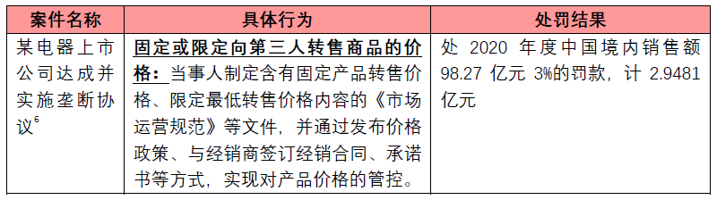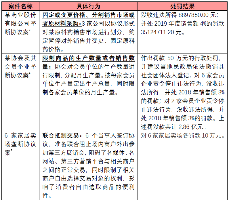 下表总结了近几年发生的涉及横向垄断协议典型案件,包括涉及的具体行为及处罚结果。