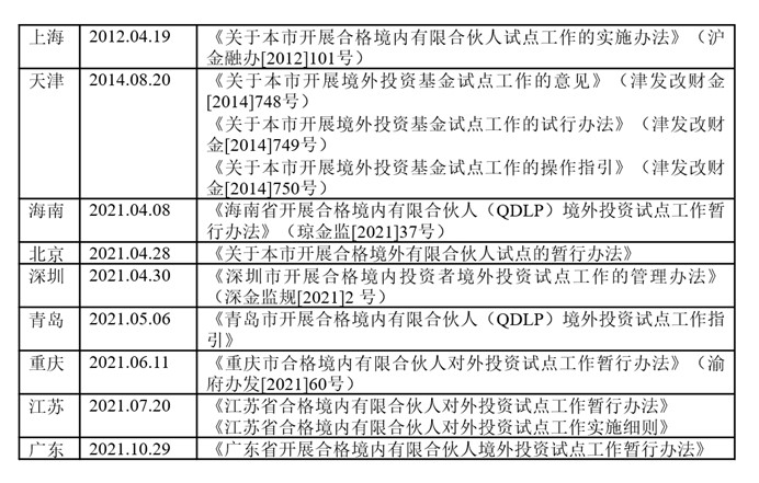 2012年,上海率先提出QDLP试点,之后陆续推广到其他若干省市,包括:天津、深圳、青岛、北京、海南、重庆、江苏、广东等地。2021年,以深圳、青岛为例的早期试点地区也积极修订与完善试点规则,调整了通过QDLP/QDIE对外投资的门槛。