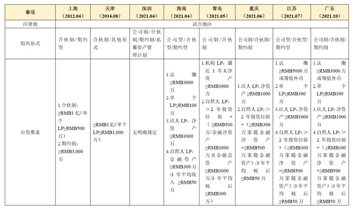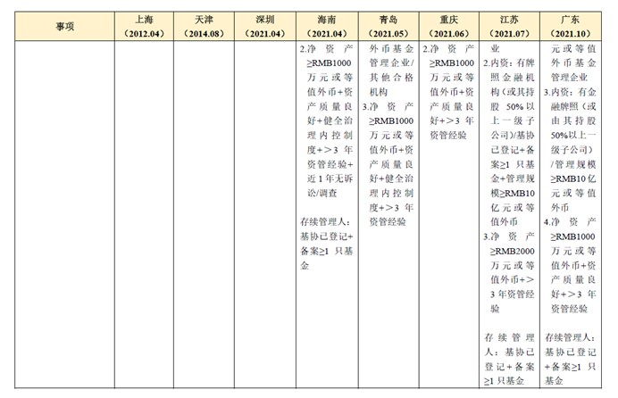QDLP/QDIE制度为地方性试点制度,各试点地区结合其实际情况对QDLP/QDIE管理人及基金相关事项作出了部分差异性规定,下表总结及对比了上海、天津、深圳、海南、重庆、江苏、青岛、广东八地[2]QDLP/QDIE试点制度的主要内容。