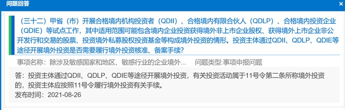 答:过往一般理解为只需遵守QDLP/QDIE的规定及程序,无需再履行ODI审批程序。但是2021年7月,某央企QDII境外投资未经发改委ODI审批违规遭重罚;随后,国家发改委于2021年8月在其官网更新了《除涉及敏感国家和地区、敏感行业的企业境外投资项目外,中央管理企业境外投资项目和地方企业投资3亿美元及以上境外投资项目备案核准办事指南》,国家发改委认为即便是通过QDII、QDLP/QDIE开展的境外投资,只要落入11号令[3]投资范围,则仍需要走ODI程序。