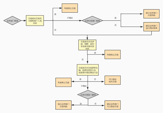 合规义务入流程则需要先归纳总结外法内规中要求进行合规审查的核心要点,然后根据业务开展的前、中、后端能够接触的业务信息的实际情况,按照识别出风险和不确定性后逐级上报的原则,设置合规风险审查流程,实现不同岗位在日常业务中按次序履行合规职责。