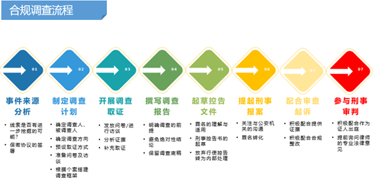 反舞弊合规调查没有固定流程,大致流程为:事件来源分析→制定调查计划→开展调查取证→撰写调查报告→起草控告文件→提起刑事报案→配合审查起诉→参与刑事审判。