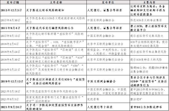 早在2013年12月3日,中国人民银行等五部委就联合发布过《关于防范比特币风险的通知》(“2013年通知”),明确比特币定性为商品,并禁止各金融机构和支付机构为比特币提供服务。94公告明确禁止代币发行融资、禁止代币融资交易平台的虚拟货币兑换等业务。后续多个部委、行业协会多次发布了关于防范虚拟货币相关风险的提示、公告、通知。
