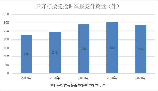 2021年,OAI总计新受理投诉258起。虽然受疫情影响,海外工程建设和招投标活动减少,但是亚开行2021年新受理的投诉数量仅较2020年有小幅回落,基本与2019年持平,在历年中属于较高水平。