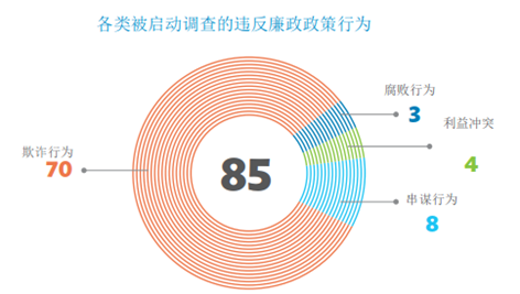 2021年,OAI经初筛评估后,对85起投诉启动了外部调查程序,其中包括欺诈行为70起、串谋行为8起、腐败行为3起和利益冲突4起。即,欺诈行为是OAI调查和处理的各类违规行为中的最高发类型,数量占总量的82%,约为排名第二的“串谋行为”的九倍。针对腐败行为的调查仅3起,相较投诉数量,调查转化率不足8%。