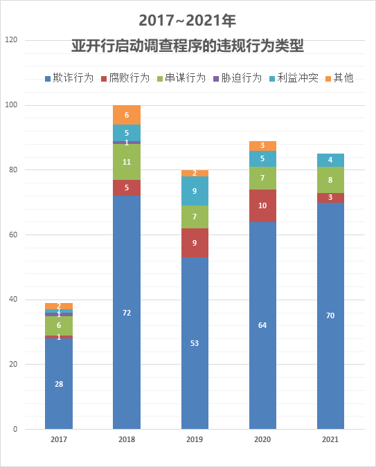 根据我们的经验,欺诈行为被认定的概率高,与其构成要件特点密不可分。并且从合规调查角度而言,相较于贿赂、胁迫等其他违规行为,投标文件中既往业绩、人员配备等缺陷,最容易被发现和查证,调查难度和成本均相对较低,从而使之成为多边开发银行合规调查及处罚的重点。多年以来,涉嫌欺诈行为的合规调查数量长期保持绝对第一。