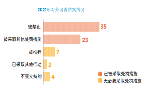 在2021年OAI结案的71起外部调查案件中,58起案件的调查对象被亚开行采取制裁措施,其中35起被处以禁令制裁(禁止参与亚开行出资、管理和支持的项目,包括禁止、有条件的禁止、有条件的不禁止),23起被采取其他处罚措施(包括批评、赔偿和警告),13起未采取处罚措施。