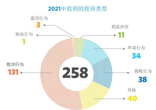 在2021年收到的258起新投诉中,排名前三的分别是欺诈行为(131起,占比约51%),腐败行为(38起,占比约15%),和串谋行为(34起,占比约13%)。欺诈行为仍是投诉所涉的最主要违规行为,相当于被投诉的其他违规行为总和。