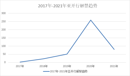 近五年,亚开行的解禁数量持续攀升,虽然2021年的数据相较2020年有所回落,但并不影响亚开行积极解禁的大趋势:2017年,仅有2家企业获得解禁;2018年有23家企业获得解禁;2019年亚开行解禁了49家企业和3名个人,2020年有236家企业和27名个人获得解禁[CX/1] ;2021年,在审核评估收到的解禁申请后,亚开行解禁了67家企业(包括43家子公司和15家分支机构)以及13名个人。