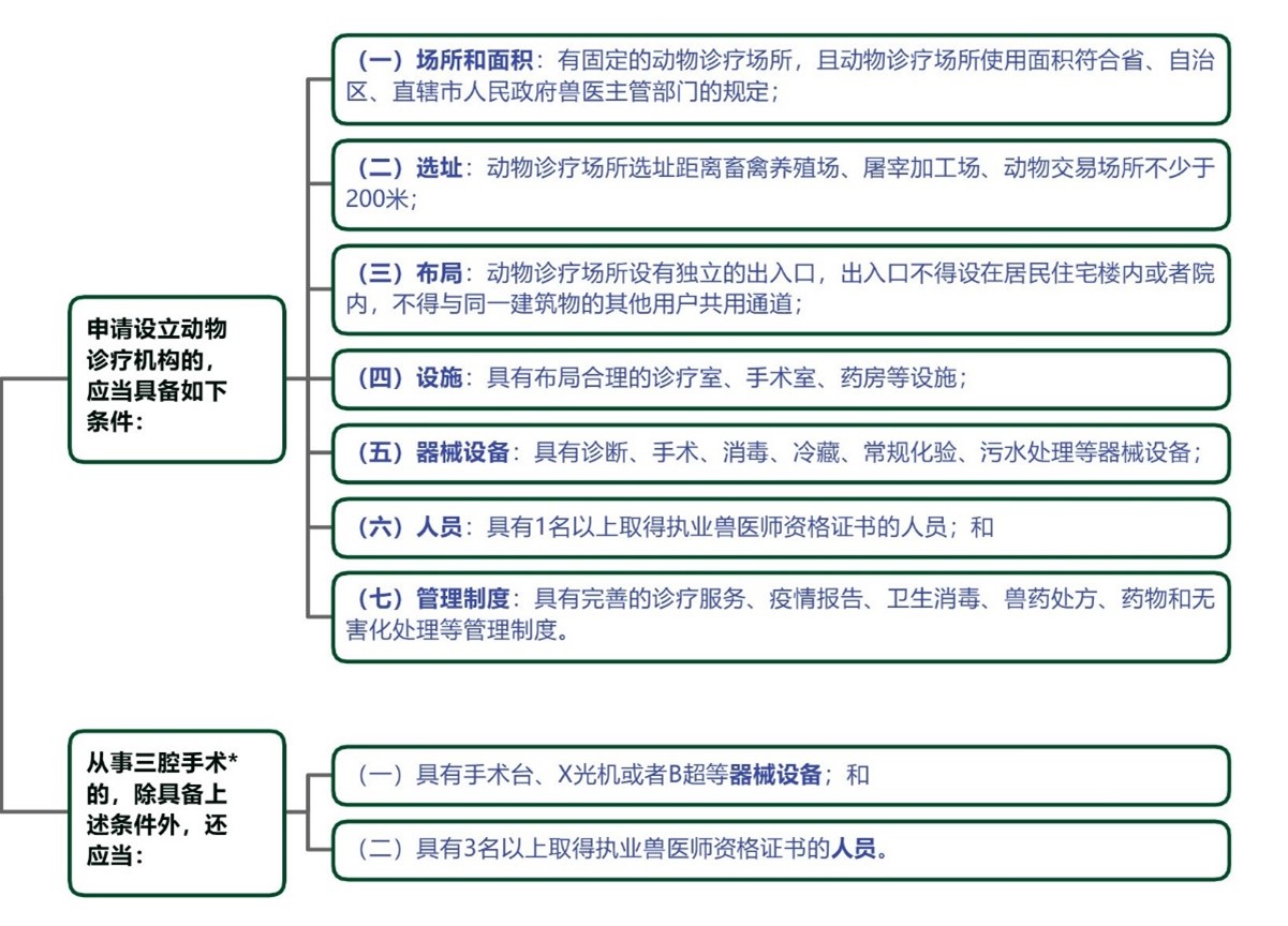 动物诊疗实行许可制度。《动物诊疗机构管理办法》(“《诊疗机构管理办法》”)明确规定,从事动物诊疗活动,需在满足下列条件后取得动物诊疗许可证: