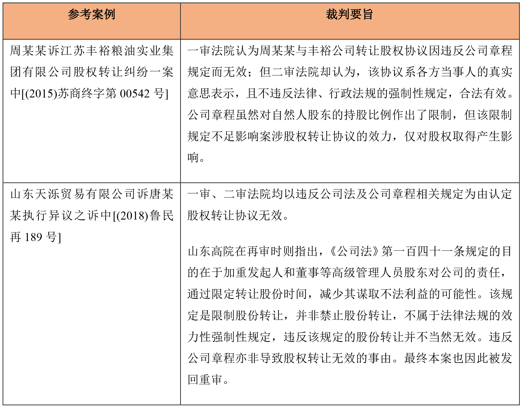 但是,《公司法》第七十一条及第一百四十一条对于有限责任公司及股份有限公司的股权(股份)转让做出了限制性规定[2],同时规定了公司章程可以就相关事项另行约定或加以其他限制性规定。考虑到前述《公司法》项下的股权转让限制性规定,违反公司章程的股权转让协议也可能违反《公司法》,在这种情况下,股权转让协议的效力如何认定?主流观点认为,中国法下的强制性规定具体可分为效力性和管理性两种,其中只有违反前者才会导致合同无效。那么《公司法》下对于股权转让的限制规定是否属于效力性强制规定呢?对此,笔者认为《公司法》下限制股权转让的规定并非效力性强制性规定,因此不属于导致股权转让协议无效的事由。以下两个案例颇具参考价值。