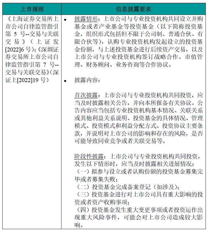 根据相关上市监管规则,上市公司参与并购基金的主要信息披露要求如下表格所示: